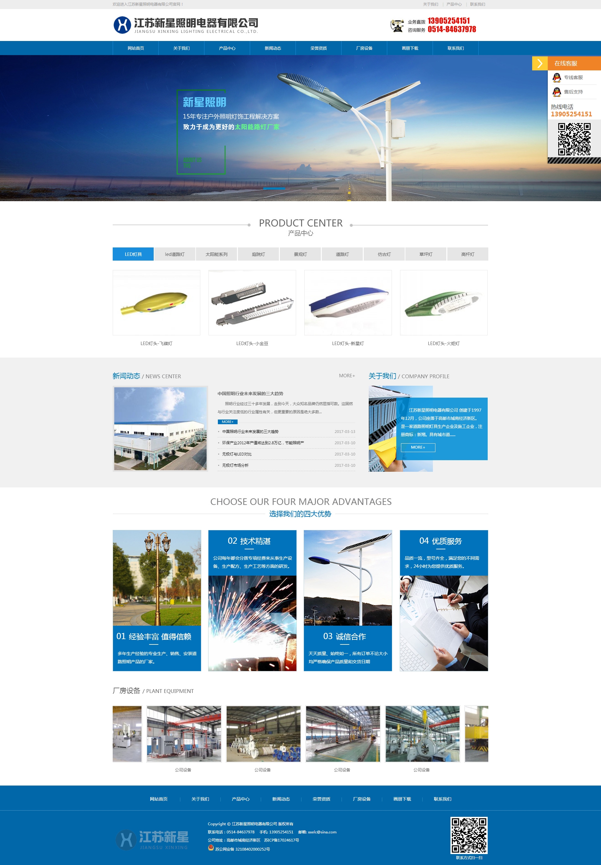 江苏新星照明电器有限公司 江苏新星照明电器有限公司创建于1997年12月,公司座落于高邮市城南经济新区。是一家道路照明灯具生产企业及施工企业,注册商标:新翔。具有城市道路照明工程专业承包二级资质和安全生产许可证,取得国家CQC认证和国家节能认证,产品进入国家政府采购清单,近几年取得国家外观设计专利10多项,实用新型专利8项,2013年被评为扬州市名牌产品,取得国家ISO9001质量管理体系认,ISO14001环境管理体系认证,28001职业健康安全管理体系认证。屡次被国家工商部门评为“重合同、守信用”先进单位,江苏省“AA”级信用单位,诚信单位,被金融部门授予“AAA”级信用企业,公司以科研为动力,视质量为生命,把用户当上帝,已形成了完善的科研、生产、和经营体系,技术力量雄厚,各类专业人才齐全,具有高效而灵活的新产品开发和品质管理能力。 查看网站Service